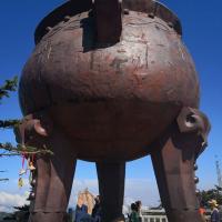 来到神农架的第三天,驱车前往神农祭坛。在蒙蒙的细雨中迈过343级台阶登上了神农坛。神农祭坛的主体建筑是神农巨型牛首人身雕像。高21米,宽35米,相加为56米,以示中华56个民族紧密团结,欣欣向荣。雕像立于苍翠群山之间,以大地为身驱,双目微闭,洞察秋毫,似在思索宇宙。五色石分别为五行学说中的金,木,水,火,土。近处,高10米的图腾柱分别立于祭坛的左右两边,柱上的大小牛首以示神农氏为牛首人身,子孙后代繁衍之意。图腾柱的前方有两幅大型浮雕,展现了神农氏一生的丰功伟绩。