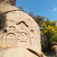 十一先到北镇双塔、阜新海棠山、朝阳化石谷、最后参观锦州博物馆,一路上高速畅通,游人不多,食宿价格适宜,真心推荐! 海棠山被誉为“佛教艺术名山",山上的摩崖石刻随处可见、轮廓清晰,在婆娑树影的映衬下尽显密宗特色;山顶远眺层林尽染、黄绿相间的树叶夹杂着点点艳红,好一派醉人的秋之韵!树上的小松鼠欢快地跳跃着、捧着松塔啃个不停…… 何必去扎堆呢!