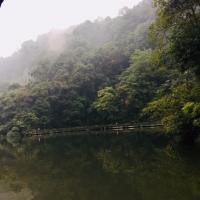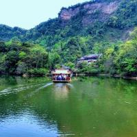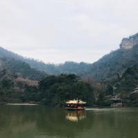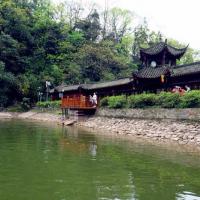 月城湖一片不是很大的湖,可以船游对岸,也可以走到对岸。在青山中不是很突显,但很静。青城山真的不愧是天然氧吧,绿植不是一般的多,进入景区大门后,上山前必经这里。游客们可以乘渡船(船票5元)到对岸,或走一旁的栈道绕行过去,不远