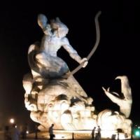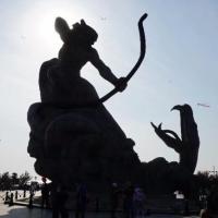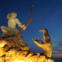巴陵广场位于美丽的洞庭湖畔,附近就是岳阳美食街汴河街和岳阳楼公园,是岳阳最为热闹的场所之一。这个面积4万多平方米的广场最明显的标志就是那座高达16米的“后羿射巴蛇”雕塑,取自山海经巴蛇食象的故事,相传后羿曾斩巴蛇于洞庭湖,积骨成丘陵乃有岳阳,用神话传说诠释了岳阳这座城市“巴陵”称呼的来源,也体现着“羿射巴蛇,万民乃安”的意思。