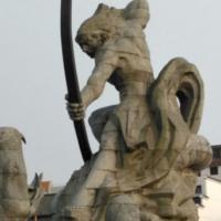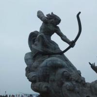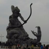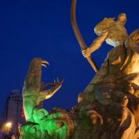岳阳的巴陵广场,广场比较大,正对着洞庭湖,广场的中央有一个很大的雕塑,名字叫后羿斩巴蛇,晚上的时候人很多,广场的侧方有一条商业街的入口,直通到岳阳楼正门的停车场,街里有很多的商铺,也有很多特色小吃,吃货们逛完广场可以去那里转转。