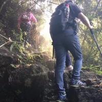 一直醉心于探秘冒险,所以特地安排了这个茂兰原始森林,出发前,还有点小激动咧~山里的清晨空气格外清新,我们一行人出门了,这深深浅浅的绿印着蓝蓝的天,养眼啊!山上的路就是走的人多了就成了路,脚下很滑,路上又陡又窄,走路要十分小心,还要扶着旁边的岩石树木慢慢上爬老话说,上山容易下山难,以前走的都是修好的栈道,没体会到下山难,这次走过原始的泥路石路后才真体会到下山难,下山时手脚并用,拉绳子,抱树,扶岩石,注意力高度集中,一点都不敢松懈,生怕脚下一滑,那可就刺溜到悬崖下面去了,而且带着你前面的人一起溜,可不是开玩笑的。有几次脚底打滑,幸亏抱住了树,算是有惊无险。山路十八弯,蜿蜒曲折,刚下过雨,路面湿滑,