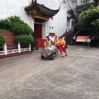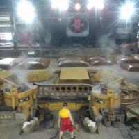 整个泸州国宝窖池景区并不大,刚到景点门口,便闻到一股浓重的酱香味,就是那种大酱的味道,讲解员说那是因为酒曲发酵的原因,进入后,发现是园林式的建筑风格,最远处是整个酿酒过程的石刻画。进入窖池观赏区后,可以看到整个老窖酿酒的过程,有工人师傅们正在生产,幸运的见到老窖原浆从“牛尾”出流出。