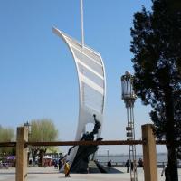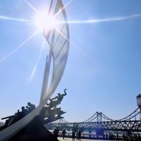 鸭绿江公园是游览鸭绿江两岸风光,尤其是中国一侧的城市建设,也可以看到原生态的朝鲜美丽风光,对面就是新义州,在我们这一侧,城市雕塑和园林建筑浑然一体。