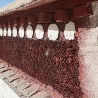 红宫的红色是特有的藏药的颜色,可以防虫,红色的部分不是红色砖头,一种植物,上面在图上藏药。宫建于1690年,当时,清康熙帝还特意从内地派了100余名汉、满、 蒙工匠进藏,参与扩建布达拉宫这一浩大的工程。
