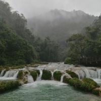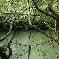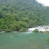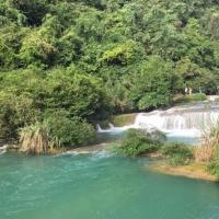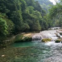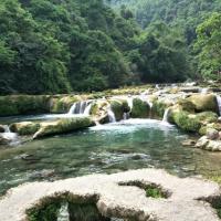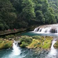 小七孔在摆渡车区间,玩完这个景点去车站,摆渡车会带你到下一个景点,不会走回头路,稍微有一些人造景观,满眼的绿色,总体感觉不错,其实还是照片好看,不知道为什么有些水里会有泡沫,看起来有些脏,只是没有艳阳高照,要不然水会成蓝色。虽然是出了五一假期的第一天,也没有人很少,老年团居多