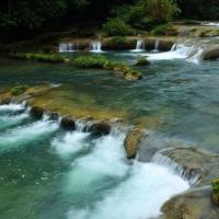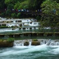 小七孔景区由于地形的起伏,从高到低时而平缓,时而倾斜,形成了六十八级跌水瀑布。 层层叠叠的六十八级瀑布,哗哗喧喧倾泻而下,似银河泻地,形态各异,气象万千。千姿百态的瀑布跌水竞领风骚,争奇斗艳,构成风情万种的动态水景,每到一段都有不同的景色,时而河水变的汹涌澎湃,时而变的细腻优雅。六十八级,很好的形容了跌水瀑布。