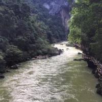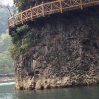 大七孔和小七孔合并后,游客明显增多,狭窄的栈道人流攒动,中午出景区才宽松一点。看完小七孔后,大七孔确实差一点,不是不漂亮,而是被小七孔掩盖了。大七孔有两个必去景点,天生桥和妖风洞,团队一般都在天生桥就转头了,妖风洞那边去的人会少很多,不过妖风洞还没有开放,只能远观,照几张漂亮照片还是可以的。大七孔还有一个亮点,就是游船,碧绿的湖水上乘风破浪,也是一件惬意的事。