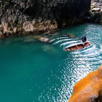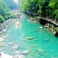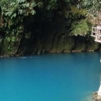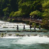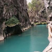 大七孔景区比小七孔要小很多,沿梦塘河两岸栈道行走于峡谷间,两个小时足够了。它最大的靓点在于天然形成的天生桥,像一座巨大的单孔桥横跨梦塘河之上,又仿佛是一道凯旋门。穿越这道门,如入人间天堂,碧蓝碧蓝的水,宁静幽雅。