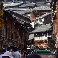 西江千户苗寨的苗家木楼,连绵蜿蜒成一大片,几乎没有一点空隙。进入村内徒步闲逛,仿佛置身于迷宫中,狭窄的巷道四通八达,为免像盲头苍蝇到处乱撞,我选择了从一头上山,再从另一头下山,这样就不易迷路了。