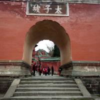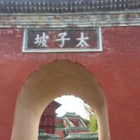 复真观这里是景区车的中转地,很是热闹非凡。你会发现武当山有很多类似含有太子的地点,其缘由就是武当山供奉的真武大帝成仙前是一位太子,所以所谓太子坡,就是和真武神有关的地方,太子坡是真武大帝未修成正果前所居之地。大门门额上刻有“太子坡”三字,进门后有长里许的云墙依山而筑,沿着山势逶迤起伏,名“九曲黄河墙”,里面有“一柱十二梁”的建筑奇观可一看。
