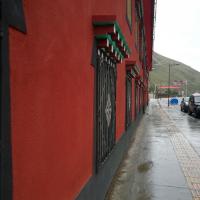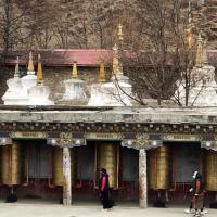 我首先游览著名的塔公寺(10元),规模较大,有好几间色彩鲜艳的大殿,寺内挂着的经幡在湛蓝的天空下飘扬,寺后山坡上也插满了经幡,像有千军万马在摇旗呐喊。寺门外倚墙坐着一排老年藏民在聊天或休息,我拍照时他们都用手遮挡,于是我就假装到处取景,偷拍了两张。我再跟随朝拜的藏民绕着寺庙外墙转寺一圈。