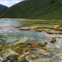 泉华滩是个钙化池,景区门口有藏民收门票,要价25一人,被我们降价到20一人。泉华滩有“小黄龙”之称。和黄龙一比规模真的是小,但相比于黄龙钙化池的只可远观,泉华滩则显得亲民多了。你可以走进它,更可以触摸它。池水没有黄龙绚丽但依旧多彩缤纷,但池子里点点的石花,依依的水草甚是可爱。可惜下午的天气又开始变阴郁了。若是晴天,景色应该会更美吧!