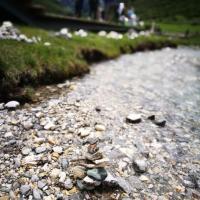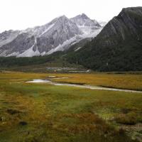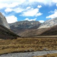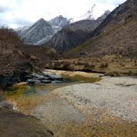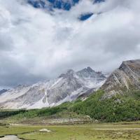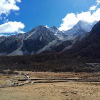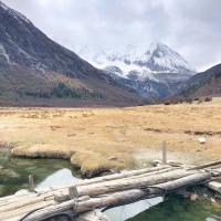 到达洛绒牧场,很多人会直接坐电瓶车到达牧场的尽头开始爬山。可是如果时间充足的话,其实可以先在牧场上徒步一下。 我在五月初的时间来的亚丁,此时的洛绒,两边山上虽已绿意葱葱,牧场上的夏草还未长成,一群群的羊群和牦牛正三三两两悠闲的在牧场上觅食,啃食着低矮的灌木。 一条干涸的河道,远远的延伸到远处神山的脚下,等待着从雪山上流下的雪水能把他灌溉。