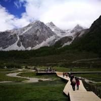 洛绒牛场就在雪山的下边,有很多的草坪,而且有河流,感觉这里的牛羊生活的特别的幸福。非常壮观的一个农场。而且景色也是非常美。洛绒牛场的草甸还是很美的,沿着木栈道边走边欣赏草场上的野花,旁边路上载着人的马帮不时走过,很有意境。