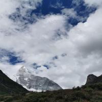 洛绒牛场是很值得一去的地方,这里可以清楚的看到央迈勇和夏诺多吉这两座神山。天气很好,天很蓝,两座神山耸立在那里,洁白的雪峰直插天际,阳光撒在雪山之颠,圣洁而又宁静。
