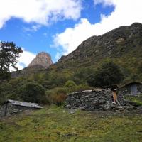 洛绒牛场有很大的牧场,有很多低矮的石头房子,据说是采冬虫夏草的人休息的地方,不仅有牛,还有很多岩羊,悠闲地在林中漫步,一条小溪潺潺流淌,是由山上的白雪融化而成。只有到了牛场才能近距离的看到著名的三座神山。