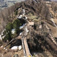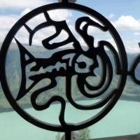 从游客中心坐小巴到观鱼台停车场只要几十分钟,可一路上坡的走路要1个多小时,我们在车上与4人打了照面,他们要走的路还挺长呢。观鱼亭的小巴往返车票60元,单程30元。要单独买票。一路上坡,车开的相当猛,坐在外侧的人必须要系安全带,否则随时会被甩出。 观鱼亭的字是余秋雨先生提名的。从停车场到观鱼亭顶一共有1068个台阶,在上坡的路上,左侧是百花园,现在一片碧绿的草地夏天最美,右侧就是天池上游三道湾,一步一景。登到亭顶,整个天池六道弯尽收眼底。