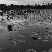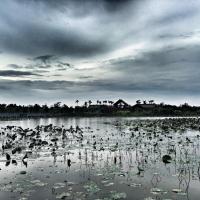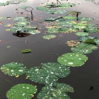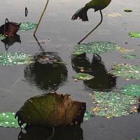 东坡书院是苏东坡被贬到儋州建立的书院,书院外,有一大片荷塘,我们去时荷花均已败落,也赶上下雨,雨点打在荷叶上滴滴答答,立即想起李商隐的诗句:留得残荷听雨声。太有意境了。于是拍下下幅照片,远处的云,中间大片的枯荷塘,近处载满雨滴的荷叶,太美了。