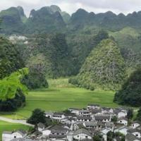 我们一行四人一早坐19路公交车前往万峰林,在景区入口乘坐景区观光电瓶车,费用110元。如果不坐电瓶车,是不用买门票的。你可以租一辆自行车,也可以沿着山间蜿蜒的电瓶车道前行,右手边既是峰林和田地、村庄组成的绝美自然风光。眼前的田地五颜六色,最令人叫绝的是“八卦田”。其实这是一个碟形的地陷漏斗,由地下河局部坍塌和地表水溶蚀而成,聪明的布依人因地制宜,围着漏斗造出了一圈圈的田地,从高处望下去,仿佛一个五彩的八卦,很是壮观。远处的峰林千姿百态,每隔一段路,都会停车给游人拍照,不同的位置可以拍出不同的感觉。车行至最南端后掉头向北,此时游人可置身万峰林脚下的布依村寨。这里有纳灰、乐立、鱼陇等几个布依村寨,