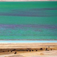当穹错在北线众多的湖泊中显得非常的特别,湖水的颜色令人惊愕,第一次来的朋友,很多都以为湖水是被化学物质所污染而变色所致。站在山上俯瞰当穹措,就像是一块翠玉雕琢在藏北高原,湖水中还有一缕缕如丝绸般的红色带状区域,非常奇特。大家都说九寨归来不看水,我想说,在西藏的湖泊,色调之丰富丝毫不亚于九寨沟的湖水。而当穹措的湖水颜色给人的第一感觉就是“假”,像是人为染的颜色,不可思议的翠绿。