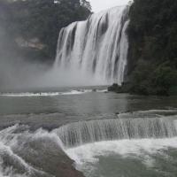 黄果树瀑布既秀丽又壮观,去的时候正好是水量充沛的时候,瀑布奔流而下,声势浩大,水流湍急,越是靠得近,水雾也越大,感觉像下小雨一样,需要打伞或穿雨衣。第一次来的旅客,去瀑布的电梯票不用买(老人与孩子除外),可买回程的电梯票。