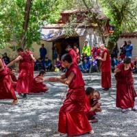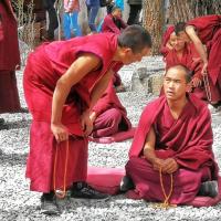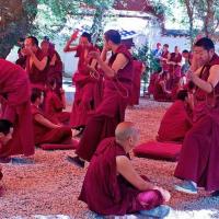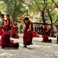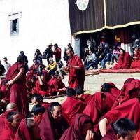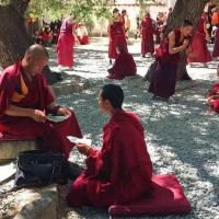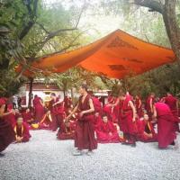 色拉寺的辩经一直在藏区闻名,也是来到色拉寺游览的重点。色拉寺的辩经仪式在寺内最北边的辩经场进行,进入寺庙大门后沿着最宽的道路直行千米左右即可到达,进入辩经场不需另买门票。也不用担心西藏午后超大的太阳,因为辩经场内众多的参天大树,阻挡了高原刺眼炙热的阳光,使这里成为一个清新凉爽的宗教活动舞台。
