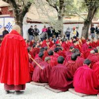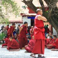 色拉寺的辩经是不可不看的藏教人文景观。每天下午三点,僧侣们来到辩经场,简短的开场仪式后,辩经开始。辩经主要是一对一的形式,也有一对多,站立喇嘛右手击打左手,提问辩论话题后手指坐地喇嘛,坐着的喇嘛抬起头进行争辩。答辩者必须不假思索地回答问题。