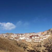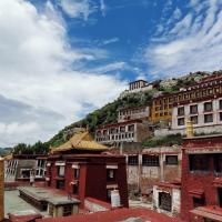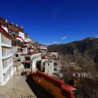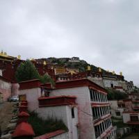到了甘丹寺后,可以先拍下全景。当地藏民到达甘丹寺后,一部分人选择一条偏上,路有点烂的路走--开始我们也疑惑,后来其他人告诉我们,他们是要转山;另一部分人选择平着直走,走的石板路/水泥路---这是到寺庙的线路。个人觉得作为游客,选择寺庙线路即可。