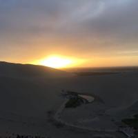 敦煌鸣沙山和月牙泉是大漠戈壁孪生兄妹,不可分割。从敦煌城向南,一眼就能看到连绵起伏的鸣沙山。鸣沙山沙漠延绵40公里,张开双臂拥抱着月牙泉。清晨,朝霞向鸣沙山洒下一片金黄,魅力无限!月牙泉则像沙漠里的明珠,散发着璀璨迷人的蓝色光辉!大美!大赞鸣沙山月牙泉景区还有许多游乐项目,如滑翔机、沙漠车、骑骆驼、滑沙……五星推荐!