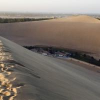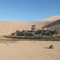 敦煌鸣沙山月牙泉已经算是很商业化的景区了,但另一方面,也正是有了相对完善的现代化设备,才方便大家游玩。 进门以后觉得像个公园,不像个景区。一边是沙滩摩托、沙滩滑翔机,一边是骆驼和电瓶车。没有尝试沙滩滑翔机因为没时间了,感觉还是很刺激的。不知道价格怎么样。 很多人选择坐骆驼,所以一进景区门就可以闻到一股浓浓的骆驼翔味...沙山上有几百匹骆驼在驮人..浩浩荡荡很壮观...感觉骆驼好辛苦.. 电瓶车可以直接坐到月牙泉景区,离得真的不远,其实没太必要坐车。 月牙泉没有想象中那么美,但是远远看去,一片沙地中有一弯绿洲,还是很让人心旷神怡的。 在沙山上拍照很美的~虽然很累~但一定要爬上去!