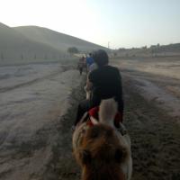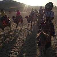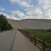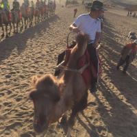 沙漠…敦煌鸣沙山月牙泉…美丽的风景,景区门票录取指纹三日内随意进出,但需要指纹+门票同时使用,这点很值得人赞赏。里面景色确实不错,月牙泉的水量越来越小了,但沙漠还是那个沙漠。里面骑骆驼100一圈,大约一小时+时间,很超值。牵骆驼的人会半路问你要不要照相,用你自己相机或手机,每人20,他会帮你找最好的地方照,我觉得很合适,他跑上跑下的很累,这个价格服务很到位,单人、合影都给照,超级漂漂啦!骆驼从入口骑到沙山上,再到月牙泉旁边停下。景区可以租防沙鞋套,15元一次,很不人性化,如果中途出去吃饭再进来,还得再花一次钱。还是推荐光脚吧,光脚踩沙子上很舒服的。