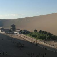 敦煌鸣沙山,风沙之中,感受西域大漠的苍凉。 作为来自沿海省份的人,第一次见到沙漠的感受极为震撼。攀爬到沙丘顶端,看着头顶的烈日和远方的黄沙,心中豪迈陡生。景区可徒步,也可骑骆驼或者沙漠摩托,甚至可以选择直升机或者滑翔机。门口有租赁沙漠鞋套的地方,所以不用担心进沙子。如果有机会去最高点的话,会看到壮观的日落景象,感受大漠孤烟直,长河落日圆。 景区交通也很方便,市区公交3路可直达。建议下午五点以后再进入景区,白天阳光非常强烈。一般日落时间大概在八点以后。景区买过票之后,三天内可免费反复进出。非常人性化。