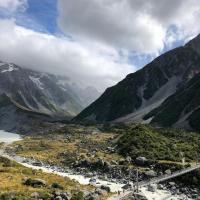 库克山国家公园位于南岛中部,风景极佳,今年去时正赶上下雨,云雾中开到山下,天逐渐放晴,库克山真容逐渐显露出来,清新的空气,鲜绿的青草,云雾缭绕在半山腰,覆盖着白雪的山峰,沿着塔斯曼步道,看到了壮观的塔斯曼冰川!