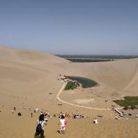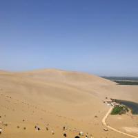 放假来到敦煌市郊的著名景点——鸣沙山月牙泉,进入景区就进入了沙漠,骑骆驼走沙漠,感觉不错,还可以玩滑沙等游戏。还有就是鸣沙山白天游客玩耍把沙子滑到下面,感觉千军万马,鼓声震震,夜里在风的作用,在回到坡上,月牙泉沙漠奇迹。
