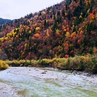 奶子沟的彩林,红的黄的绿的,五颜六色,到了这里,你才会体会到层林尽染的壮观景象,沿着小溪从海拔三千八下降到二千六,彩林越来越密,色彩斑斓,在羊茸村核心区住宿,一流享受。