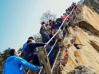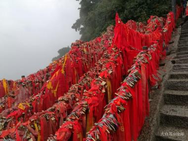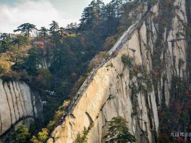 华山北峰苍龙岭是华山著名险道之一,莽莽苍苍,岭呈苍黑色,笔直插天,好像苍龙腾空。此岭上的台阶只有2尺多宽,两旁万丈深...