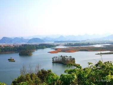 摆龙湖群山环绕,山中有水,水中有湖,湖面呈扇形分布,湖中有7座小岛和3个半岛,被游客称为“云南的千岛湖”,岛上林木茂...