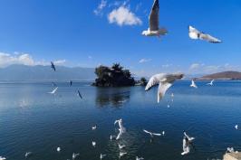 滇池为地震断层陷落型的湖泊,其外形似一弯新月。滇池的湖光山色评价各异,或许没有桂林等地山清水秀,但是在高原上有如此宽阔的水域也属罕见。站在龙门上,居高临下,滇池尽收眼底,有着“高原明珠”之称,还可以看到好多好多海鸥!