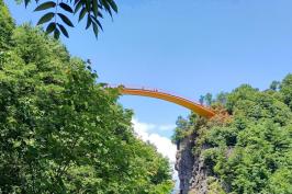 天生桥景区位于神农架南部的老君山北麓,以“奇谭”“奇瀑”“奇洞”著称。发源于老君山的黄岩河流经此地,经过亿万年地表水和地下水的流动形成一岩溶性天生穿洞,程萌芦状,高约17米,河水穿洞下泻,使黄岩河两岸一桥横贯东西,呈现出“天桥飞渡”,故名天生桥。