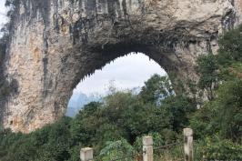 月亮山是阳朔境内奇景,是一座拱形山峰,山顶下方有一个贯穿的大洞,好像一轮皓月,浑然天成。从不同的角度看这座月亮山,此洞形状也随着不断变化,非常有趣。月亮山高约380多米,游人可顺着一条800多级的登山道直达山顶月洞。月洞面积很大,高宽各有50米,而山壁却只有几米厚。洞的顶部挂满了形状各异的钟乳石,其中两块很像月宫里的吴刚和玉兔。