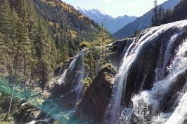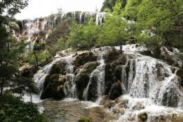 珍珠滩瀑布,是九寨沟最大的钙华瀑布,来自山中融化的雪水,从21米的高处冲进谷底,吼声如雷,卷起千堆浪花,这道激流水色泛白,是九寨沟所有激流中水势最猛,水声最大的一段。激流左侧栈道,是观赏瀑布的最佳点。珍珠滩瀑布瀑布底部空气清新,林木茂盛,踩着栈道,在激流的陪伴下继续东行,就到了珍珠滩东侧。瀑布的水因为含硫量高,不能饮用。