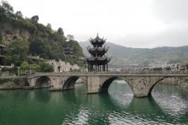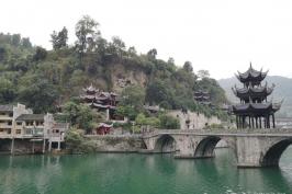 贵州镇远祝圣桥位于贵州省镇远县城东中河山,始建于明朝洪武年间。名舞溪桥,由镇远土司思南宽慰使田大雅与镇远土知州何惠同奏请朝廷修建。历经多次修建,最后一次修复竣工时,正值康熙皇帝圣诞,为向皇帝祝寿更名祝圣桥。桥上有建于清光绪四年的魁星阁,也叫状元楼,当时镇远知府汪炳敖在楼阁上题有三幅楹联。