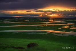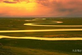 站在天鹅湖畔巴西里克山顶眺望,古老的开都河从天边缓缓向你走来。这就是“此景只应天上有,人间能有几回现”的九曲十八弯。它像是泉水和雪水汇聚而成的仙女的飘带穿过天鹅湖,更像是上苍为巴音布鲁克这个翡翠王国披上的圣洁的哈达。当夕阳从云缝中把万道霞光射向草原,落日摇金,蜿蜒如蟒的九曲十八弯就映出了后弈射下的那九个太阳。