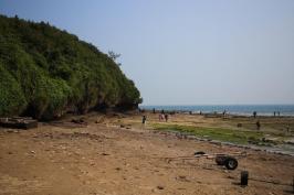 滴水丹屏位于涠洲岛滴水村南岸边,原名滴水岩。绝壁上部绿树成荫,壁上层间裂隙常有水溢出,一点点往下滴,如朱帘垂挂。由于海蚀作用,岩石的外表形态犹如一有眼、有鼻、有嘴、有发的巨型侧面“人头像”(现已倒塌),景致优美。