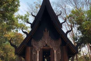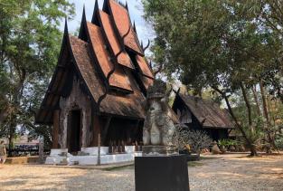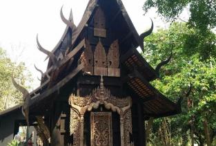 黑庙也叫黑屋,是泰国艺术家Thawan Duchanee建造的私人博物馆。黑庙并不是真的庙,只是因为整体色调是偏黑色,再加上清莱有座著名的白庙,才被人称为黑庙。它的建筑是全实木,里面收藏了艺术家许许多多的艺术珍品,有动物毛皮、牛角、画像、大贝壳、抽象雕塑等等…漫步在花园里的各个黑色小屋,他们色彩浓郁,形状奇怪,艺术气息之浓,让我感受到了黑屋主人的清奇脑洞,真是让我挪不开步,舍不得走了。
