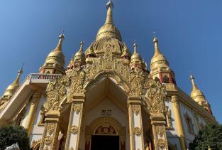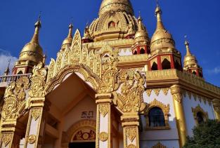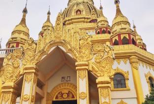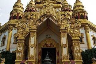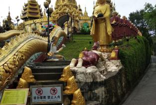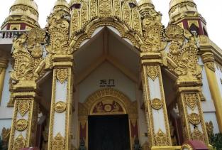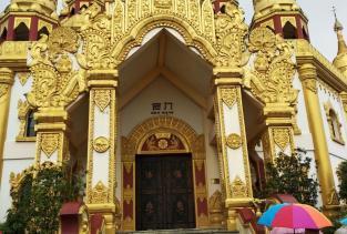 云南勐焕大金塔,位于德宏的首府芒市。 勐焕大金塔,号称中国第一金佛塔,也是亚洲第一空心佛塔。 大金塔外面金碧辉煌,十分壮观。 大金塔一共有东南西北四个门,除了西门,另外三个门都是开放的。 进入大殿是要脱鞋的,所以从哪个门进,就从哪个门出。 殿内有很多佛像,殿外有个很大的卧佛,披着金色袈裟,面目和善,闭目养神。