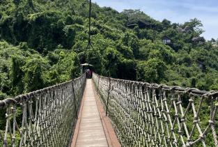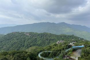 第二次来亚龙湾热带天堂森林公园,走过兰花谷看到了蛇后马上到站上坐观光车上去,过江龙索桥,在沧海楼俯瞰亚龙湾全景,风景秀丽的,玻璃栈道没有去,价格高性价比低又是中午太热了,小朋友玩了飞跃雨林等十二个项目去了非诚勿扰2
