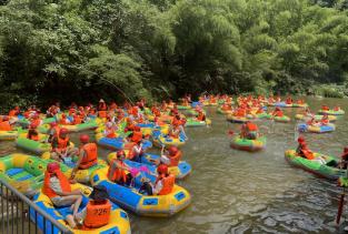 平江沱龙峡漂流:一跃而下,飞舟穿洞你敢一跃而下吗?漂流全长5公里、总落差299米的沱龙峡漂流,期待你的挑战。两岸奇峰险峻、河道波涛汹涌,五颜六色的橡皮艇鱼贯而入,从出发点开始就持续下降,十几个高落差险流接踵而来,在激流