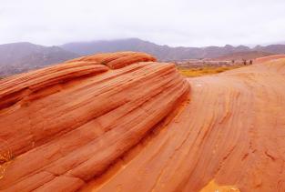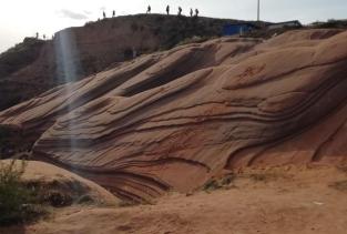 波浪谷的岩石叫红砂岩,靖边波浪谷在陕北这个黄土覆盖的地方能有这样的石头景观真是个奇迹了。那些层层叠叠的石头就像一大批铺盖在地面上浸染过后晾晒的红色布匹,一层层、一卷卷、一盘盘在夕阳的渲染之下,异常的鲜红。